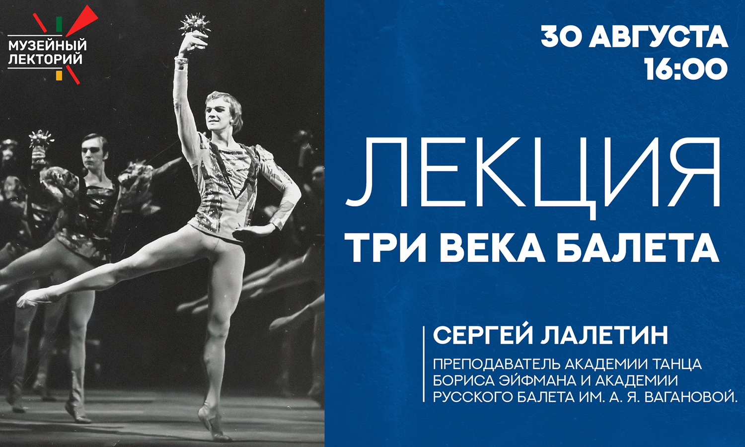 В субботу 30 августа в 16:00 состоится лекция «Три века балета». Автор, Сергей Лалетин, старший научный сотрудник Музея театрального и музыкального искусства, преподаватель Академии Русского балета им. А. Я. Вагановой и Академии танца имени Бориса Эйфмана.