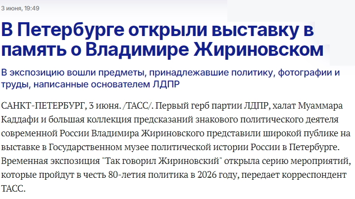 В начале июня в нашем музее открылась выставка «Так говорил Жириновский», о которой информационное агентство ТАСС составило статью.