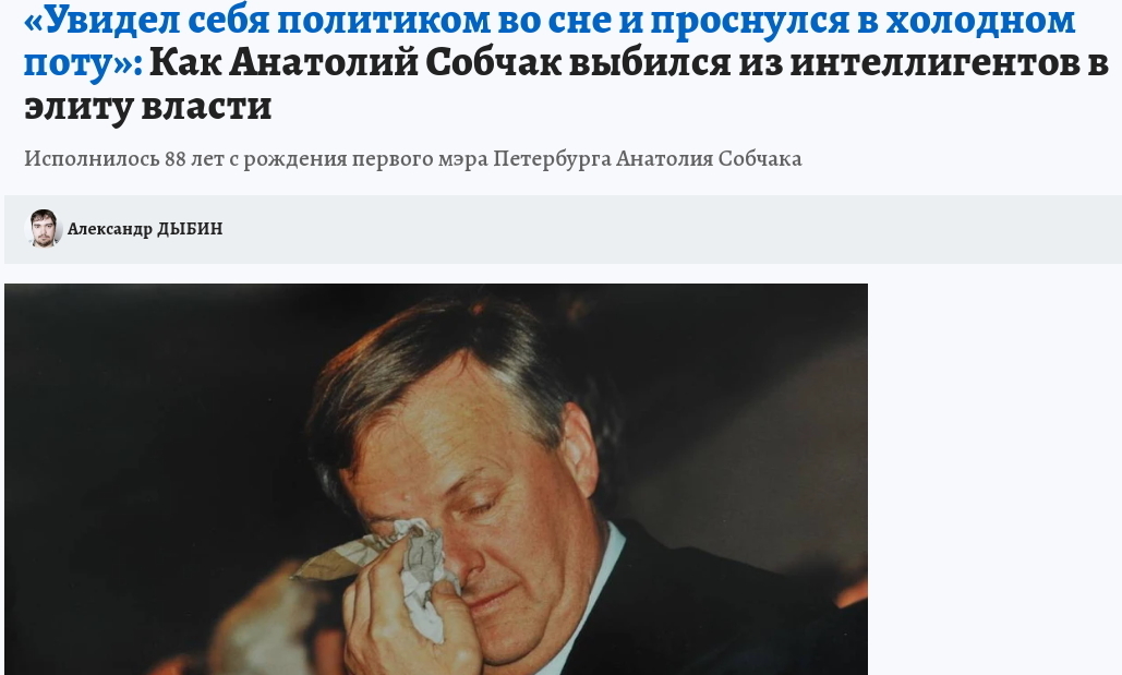 Речь в статье идет о непростой карьере этого важного деятеля перестроечной России и о том, через какие испытания прошел Санкт-Петербург в начале 1990-х.